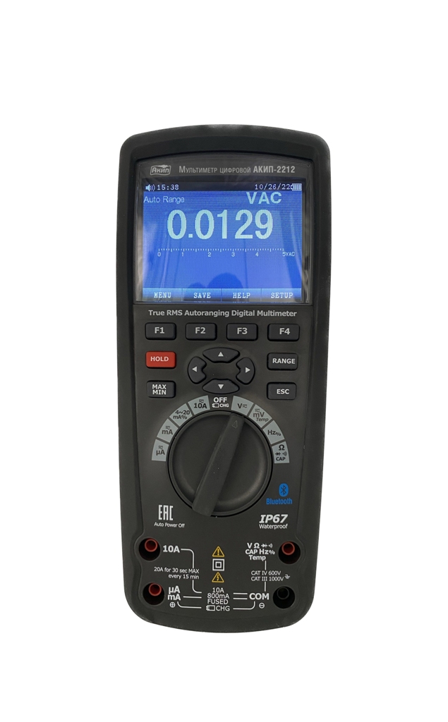 АКИП-2212 — это современный продвинутый прибор для поиска и устранения неисправностей оснащенный беспроводным интерфейсом Bluetooth. Прибор производит измерение переменного/ постоянного напряжения, переменного/ постоянного тока, тока в диапазоне 4-20 мА% (LOOP), сопротивления, емкости, частоты (электрической и электронной), скважности (%), выполняет тест диодов, проверку отсутствия обрывов в электропроводке, а также измеряет температуру с помощью термопары. Мультиметр оснащен внутренней памятью для хранения и отображения записанных данных. Благодаря прорезиненному, ударопрочному, водонепроницаемому корпусу с двойной изоляцией прибор обеспечивает высокую безопасность работы в жестких условиях эксплуатации. Мультиметр позволяет выявить периодически возникающие сбои в оборудовании и выполнять контроль электрических параметров в ЭУ.