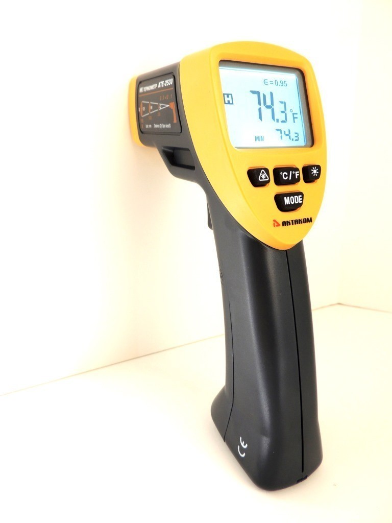 Инфракрасный термометр АТЕ-2530 предназначен для измерения температуры поверхностей пирометрическим способом. Пирометр АТЕ-2530 позволяет отображать на дисплее 2 температуры, сохранять в памяти максимальное, минимальное и среднее значение.